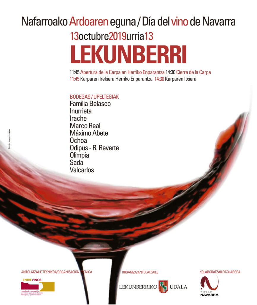 Más de mil personas asistieron al Día del Vino de Navarra en Lekunberri. Bajo el lema “Nafarroako Ardoak: Bizitzaren Ttanttak” (Vinos de Navarra: Las gotas de la vida), se celebró, el domingo 11 de Octubre, el Día del Vino de Navarra. Siete bodegas de la D. O. Navarra (Bodegas Inurrieta de Falces, Bodegas Ochoa de Olite, Bodegas Marco Real de Olite, Rafael Reverte de Fitero, y la empresa Irauli de Sunbilla, que distribuye a las bodgas Artazu, Azpea y Nekeas), participaron en la carpa instalada por el Ayuntamiento en la Herriko Enparantza.